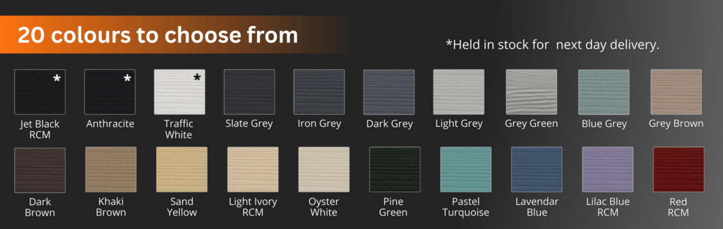 Edge Building Products will stock the most popular colours – Black, White and Anthracite Grey – ready for next day delivery. All other colours will be available to order with fast lead times.